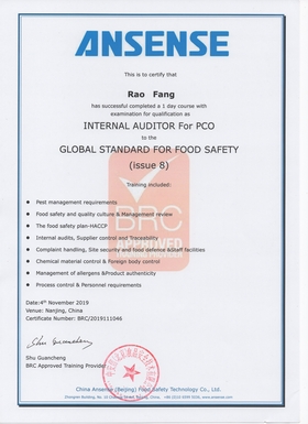 為更好的滿足出口型食品企業(yè)對蟲控工作的高品質(zhì)要求,為客戶提供一流的蟲控服務(wù),2019年11月初,我公司技術(shù)人員在江蘇省疾控中心培訓(xùn)中心參加了 BRC第8版標(biāo)準(zhǔn)內(nèi)審員證培訓(xùn)班,通過認(rèn)真的學(xué)習(xí),獲得BRC內(nèi)審員證?!? (左五:舒冠成-BRC全球食品安全標(biāo)準(zhǔn)審核員培訓(xùn)專家;左四:常州科立達(dá)有害生物防治有限公司技術(shù)部總監(jiān)-饒芳) |