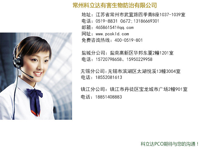 版權(quán)所有:常州科立達(dá)有害生物防治有限公司 聯(lián)系電話:0519-6892 9982; 13186669301 地址:江蘇省常州市武宜路四季青B座1037-1039室 許可證號(hào):蘇ICP備12061314